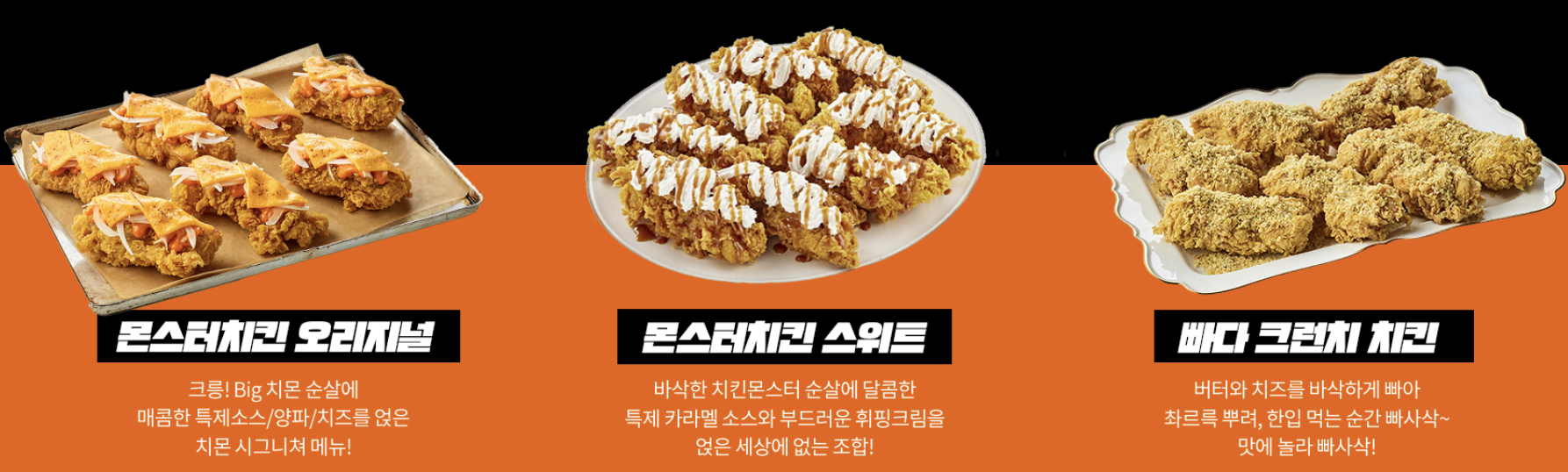 치킨몬스터는 특제소스와 남다른 큰 Size의 치킨으로 시그니처 메뉴가 큰 사랑을 받고 있다.
