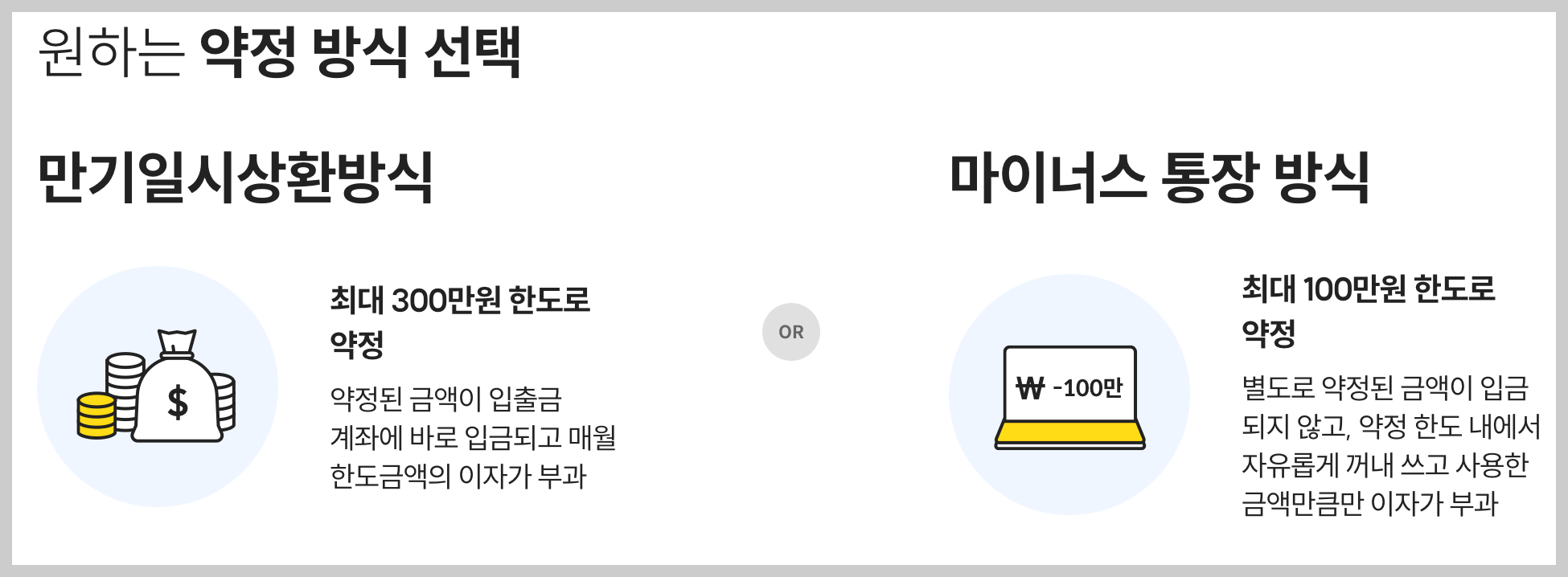 - 마이너스통장방식 : 최대 100만원 한도로 약정되며 약정 한도 내에서 자유롭게 꺼내 쓰고 사용한 금액만큼 이자가 부과되는 방식